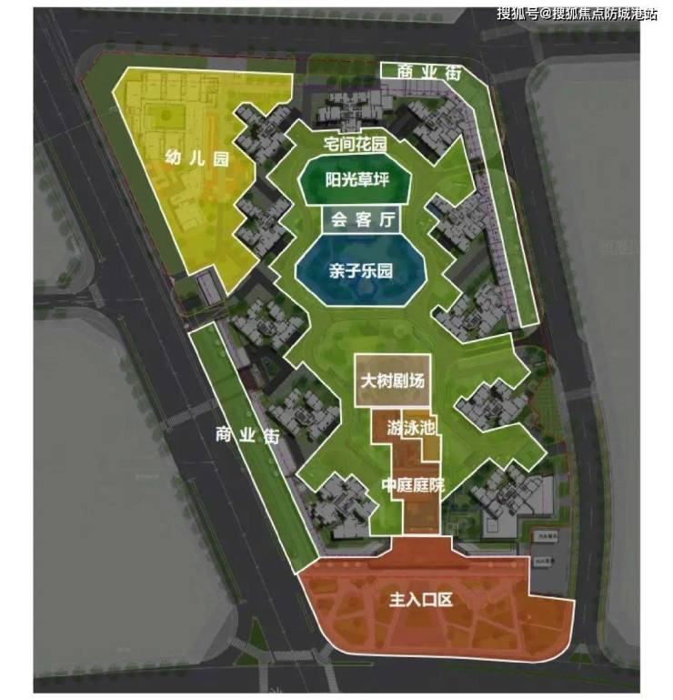 项目整体呈现点状围合式布局,商业街和幼儿园分布在外围区域,住宅楼栋中间则建有亲子乐园、阳光草坪、宅间花园、游泳池以及会所等社区配套。