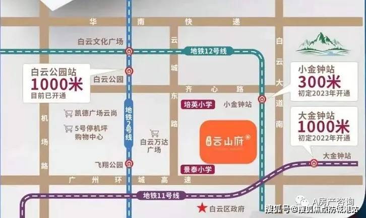 天健·云山府位于白云新城城心处,还肩负着从北进入越秀区、天河区、荔湾区的门户口岸位置,有着三地铁汇聚的立体交通网络,目前距离项目1km是2号线的白云公园站,地铁11号线大金钟站正在建设中(预计2022年将会开通),同时还规划有地铁12号线的小金钟站距离项目仅仅约200m(预计2023年开通)。