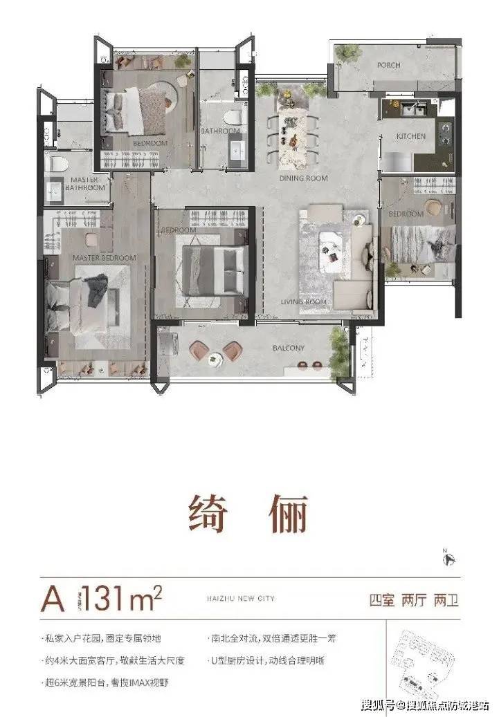 131㎡户型:包括A和B两种设计,A户型南北对流,主阳台朝南,三卧室朝南,具有较高的舒适度;B户型主阳台朝北,卧室朝南,能够享受更好的景观。