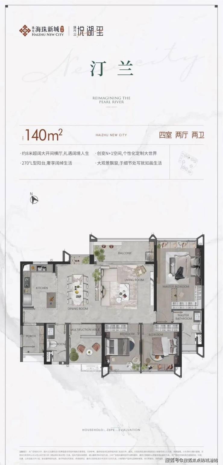 140㎡户型:独特的横厅设计,南北对流,主阳台和主卧朝北,远眺湿地公园景观;南向卧室则可以欣赏小区的园林景观,兼具景观和舒适度。