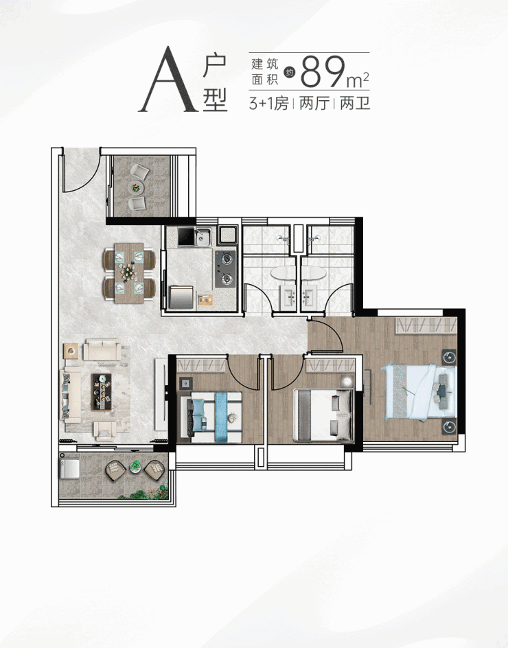 南北对流的双厅设计,四开间朝南,还有阔景大阳台,十分重视居住的舒适感。