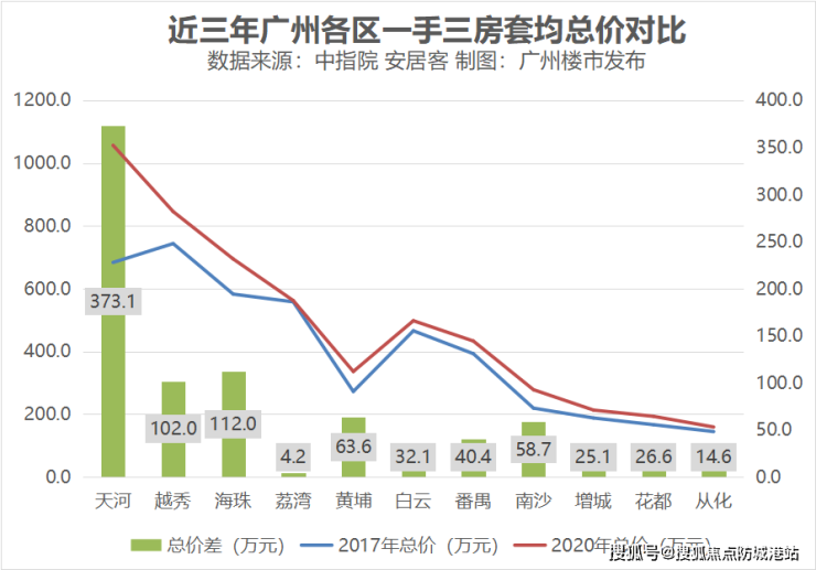 以一步到位的三房为例,按照全市102平三房套均成交面积来算(中指院数据),最高的天河已攀升至1057万总价。