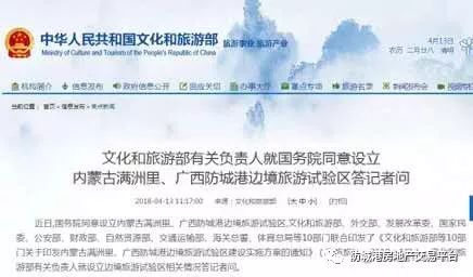 2018年4月13日 国务院同意设立,满洲里、防城港两个边境旅游试验区