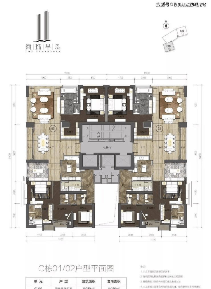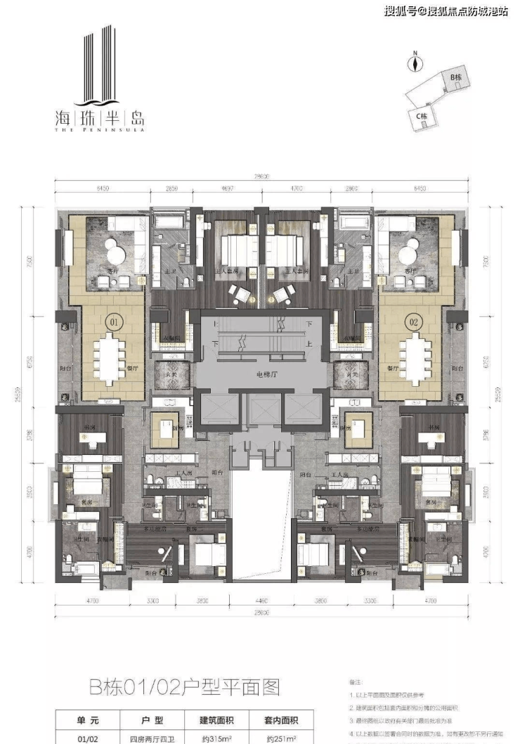 海珠半岛三期2栋高层(BC栋),楼高43层,主推290㎡、315㎡精致四房,实用率高达92%!