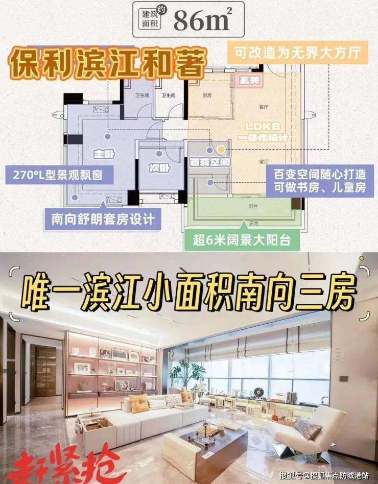 ① 建面约86㎡,三房两厅两卫设计,南向观景大阳台,全屋动静分离,主卧带270°飘窗。仅58套!
