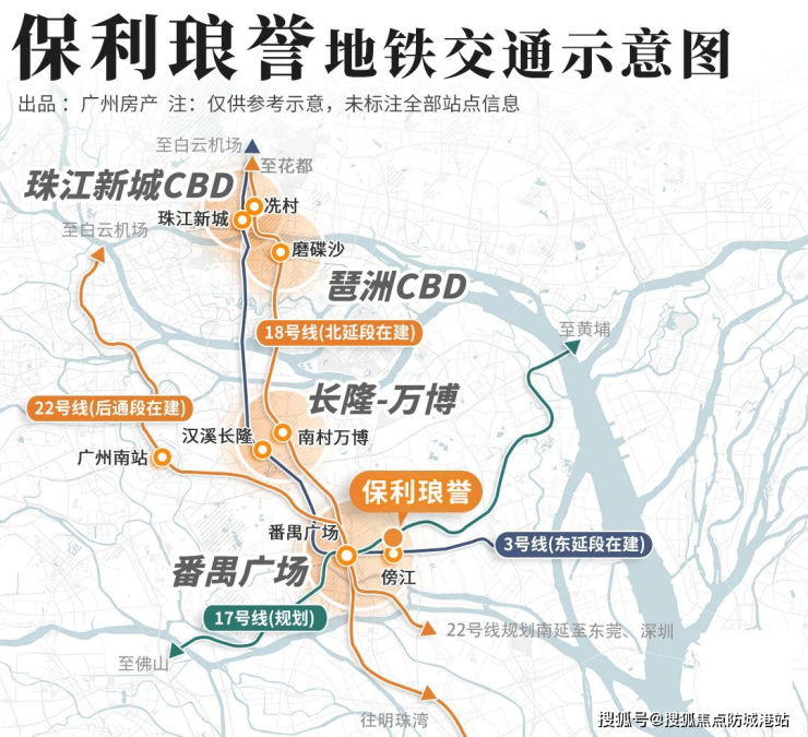一站即达番禺广场站,里面有地铁3号线、18号线、22号线、3号线东延段、17号线(规划中)五轨交汇,一站畅行琶洲,两站通勤珠江新城