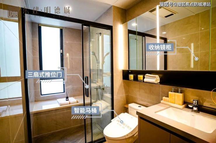 其他细节如子母式精雕铝板防火装甲门,双开门设计更气派;阳台推拉门设计,灵巧不费力;厨卫的智能马桶、三扇式推拉门、收纳镜柜等就更实用了。