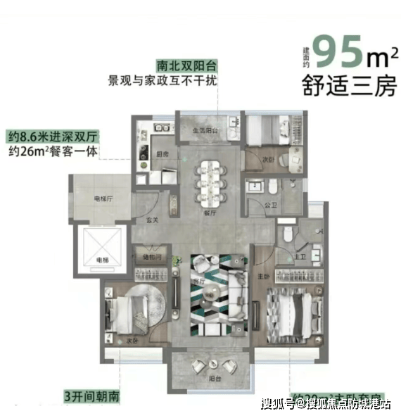 建面约95㎡小高层三房两卫:2梯2户纯板式设计,南北通透,三开间朝南,南向面宽近10米,双阳台区分生活与观景功能,卧室飘窗全赠送,空间利用率极高,堪称刚需优选。