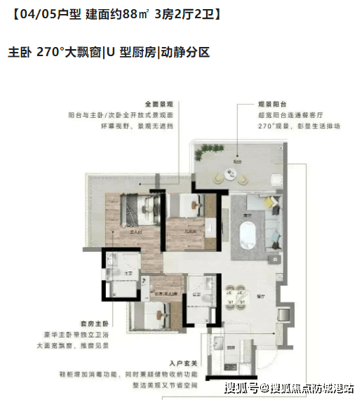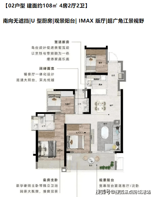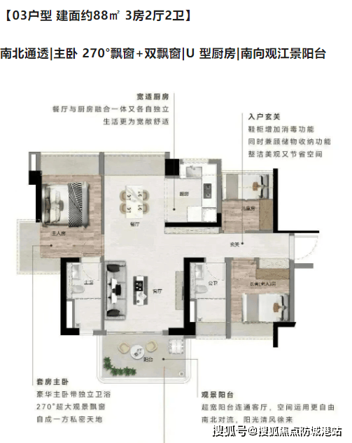 每个户型都注重细节设计,如超广角江景视野、270°主卧飘窗等,提升居住舒适度。交标方面,配备了惠而浦厨房三件套、摩恩卫浴以及瑞士恩仕智能马桶等高端配置。