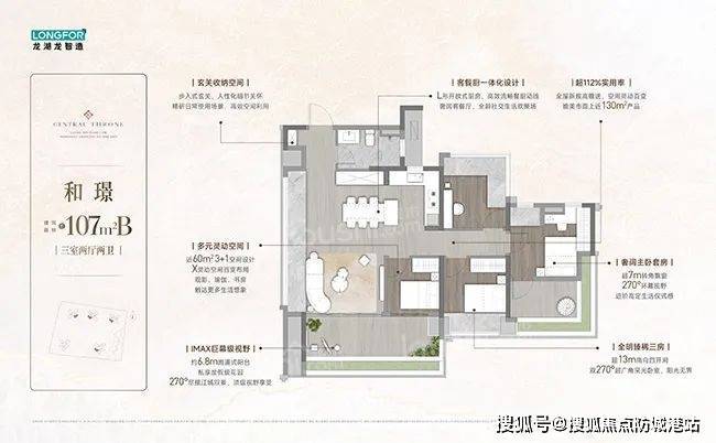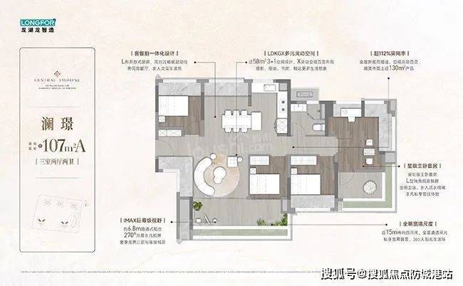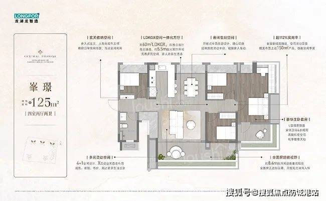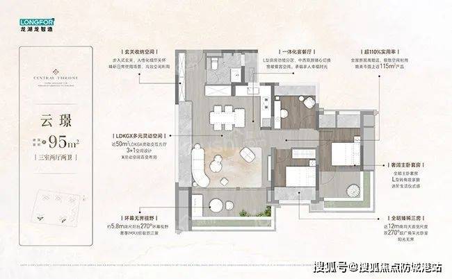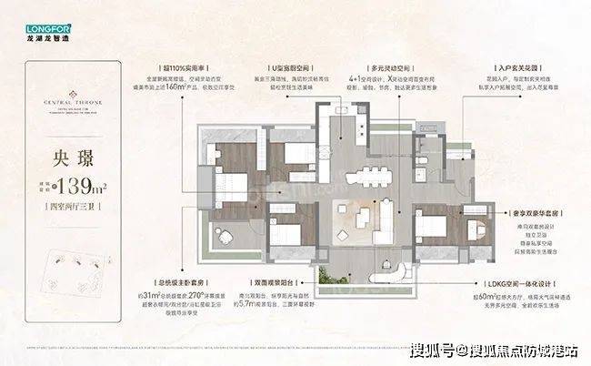 龙湖亚伦央璟颂规划了5栋32层住宅,通过“垂直园林”设计打造十处景观节点,如以岭南骑楼为灵感的架空层泛会所。将有95、107、125、139㎡低密瞰江奢宅入市,90㎡三房实现双卫配置,142㎡四房通过6.9米双阳台营造“空中茶室”,使用率或高达110%。