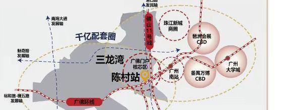 项目地理位置得天独厚,位于佛山市顺德区陈村和六路 3 号,处于佛山顺德三龙湾板块核心位置,广佛地铁 7 号线陈村站步行几百米处。东临广州南番禺万博、大学城、琶洲三大发展核芯,西接佛山新城商圈,与广州南站一河之隔,傲踞三龙湾临广头排位置。三龙湾作为大湾区轨道枢纽、广佛极点的核心,投资超 3367 亿,规划 10 条轨道,有望成为 “广佛同城新中心”,顺德陈村全域纳入其核芯发展区域,战略地位显著。