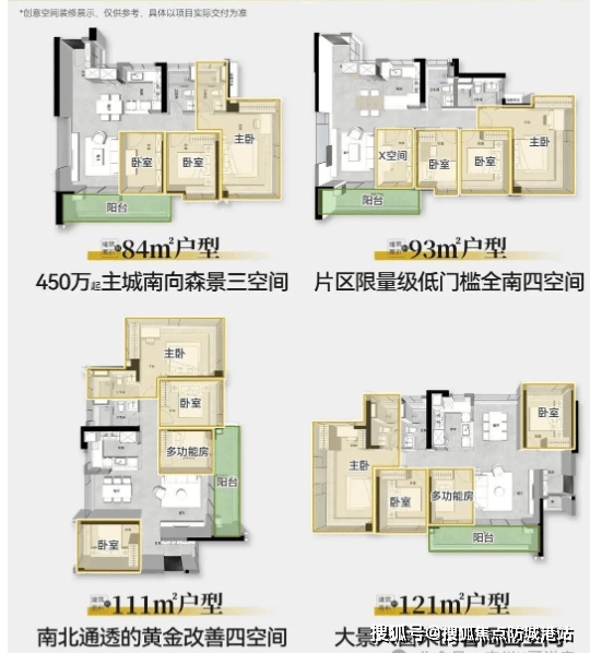 项目主推建面约84-121㎡三至四房户型,全部采用南向布局,结合“一字型”楼栋排列,实现通风采光最大化。所有户型均融入广府生活细节,从空间布局到交标配置,都精准契合老广的居住习惯,打造高使用率、高舒适度的居住空间。