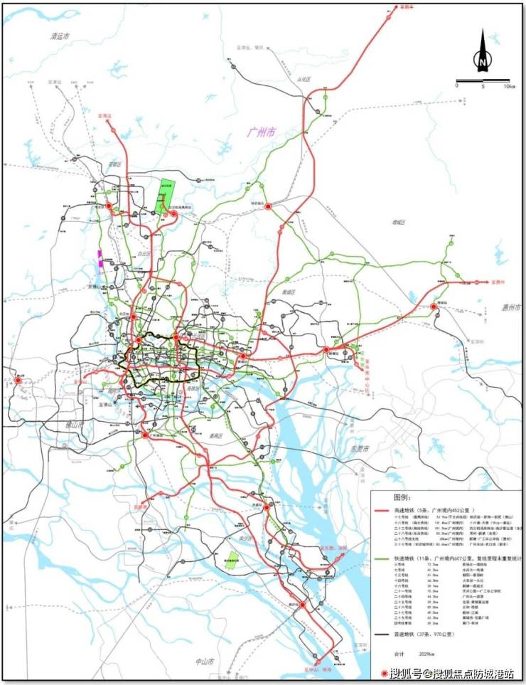 新线网规划显示,广州将打造5条高速地铁(广州境内452公里)、11条快速地铁(广州境内607公里)、37条普速地铁(970公里)形成“高速-快速-普速”三个层级、总里程达2029公里的城市轨道交通线网。