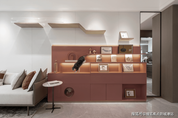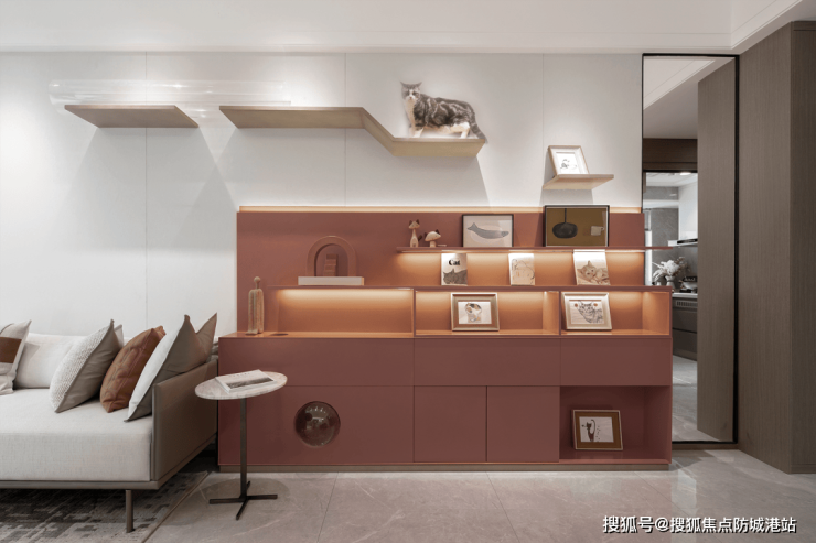 考虑到居者上班日常,客厅书架中特别设置带有透明保护罩的“猫室”,并预留充足的空间给宠物玩乐、打盹儿、晒太阳。