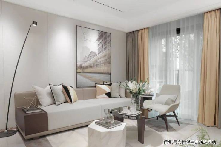 114㎡的旅游样板间更加摩登现代,客厅以黑白灰为主色调,低调优雅,明亮的黄色跳跃其中,让人眼前一亮。