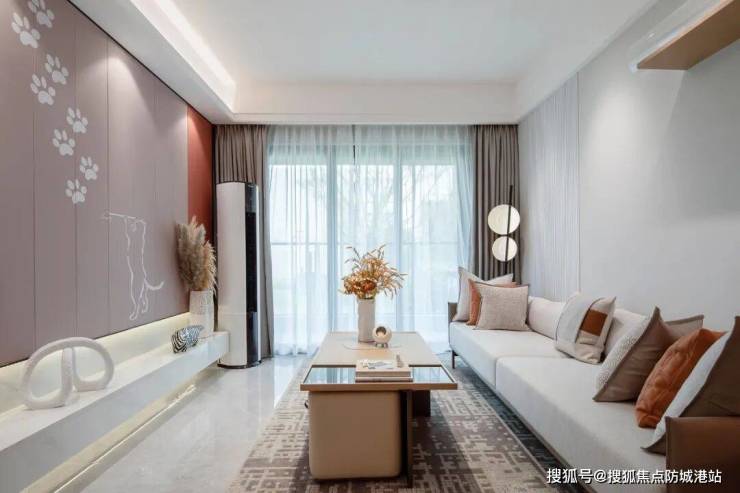 暖粉色丰富客厅视觉层次,猫咪元素装饰点缀,唤醒空间活力。落地窗采光充足,可以在客厅一边看书一边撸猫。
