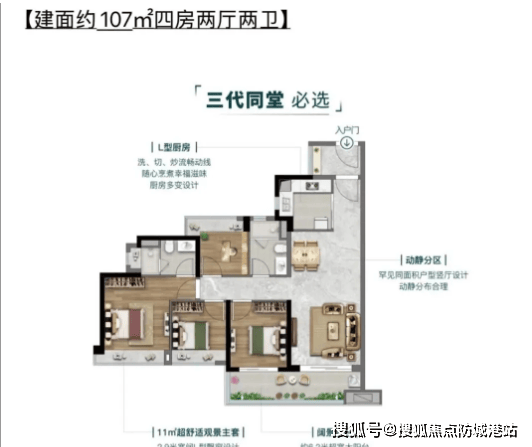 108㎡四房户型采用竖厅设计,观景阳台长达6.2米,视野开阔,可尽情欣赏户外景观;主套面积达11㎡,配备独立卫生间和衣帽间,提升了居住的私密性和舒适度。该户型适合大家庭居住,四个房间可分别作为卧室、书房、儿童房等,满足家庭的多元化需求。
