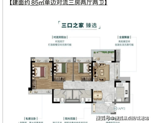 75㎡三房户型采用单边位设计,实现南北对流和360°景观视野,全屋飘窗设计不仅增加了空间感,还提升了室内的采光和通风效果。该户型布局紧凑,功能分区合理,虽然面积不大,但能满足三口之家的基本居住需求,性价比极高。