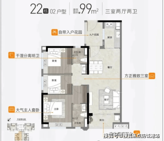 99方三房两卫户型,空间尺度进一步提升,客厅与餐厅相连,形成开阔的公共活动区域,适合家庭聚会。主卧套房设计,配备独立卫生间与衣帽间,提升居住品质;次卧空间宽敞,可根据需求改造为书房或儿童房,灵活性高。