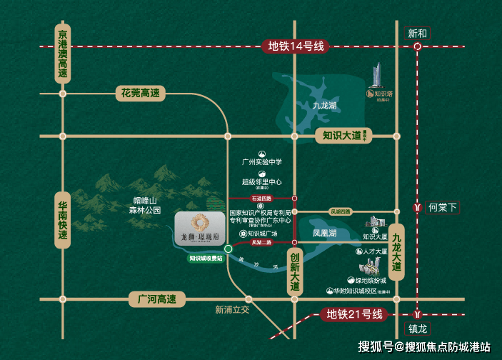 项目距离14号线何棠下地铁站约2公里,步行不太现实,需依赖电动车或短驳交通工具。不过自驾出行便利,紧邻花莞高速知识城出口,连接广河高速、华南快速、从埔高速(建设中),轻松通达天河、科学城及整个大湾区核心区域。