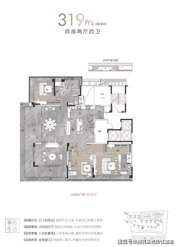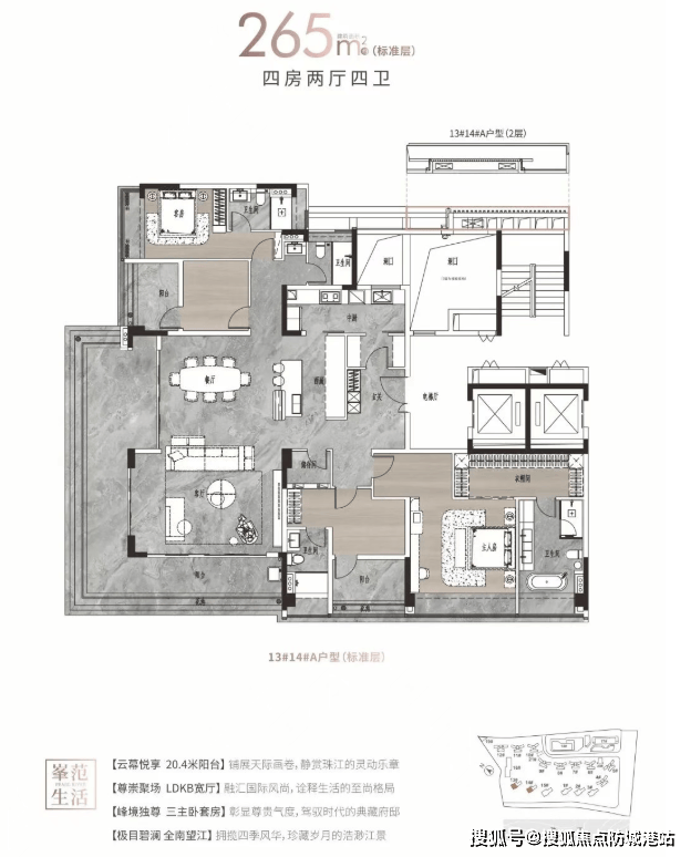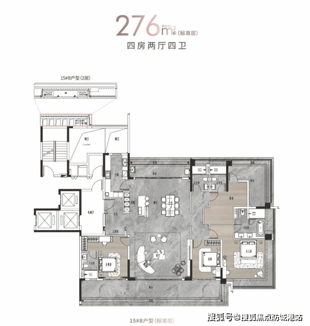 户型面积:约125-142㎡四房两厅两卫/214-313㎡大平层