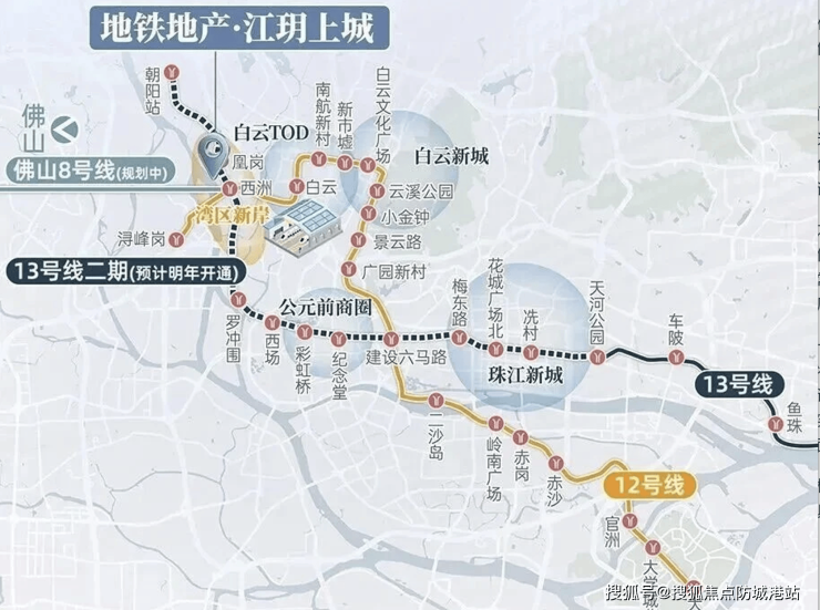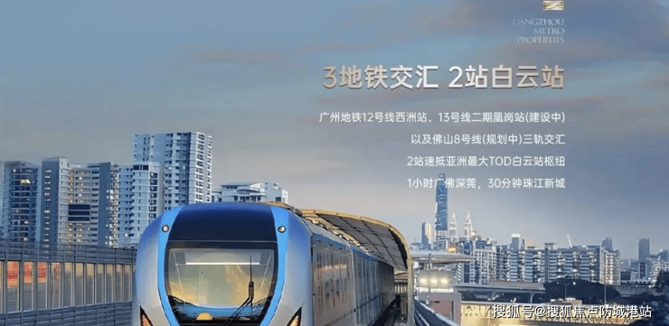 答:项目实现“三轨交汇”,13号线二期凰岗站(2026年通车)与社区无缝衔接,未来将建成地下通道直达珠江新城无需换乘;距离已开通的地铁12号线西洲站约800米,可快速换乘多条地铁线路;规划中的佛山8号线将无缝衔接广佛,5站可达千灯湖。此外,白云站已开通运营,配套6条地铁,形成多层次公共交通枢纽。