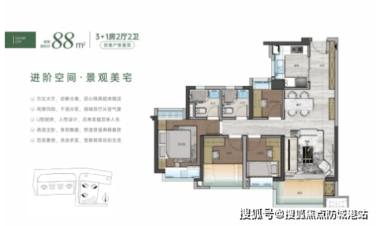 一期在售户型为72-88-105㎡四房户型,该系列户型最大的亮点是超高使用率,其中72㎡户型可做到四房,在同面积段产品中极具竞争力。户型布局方正,空间利用率高,无浪费面积;客厅连接阳台,采光通风效果优越,让室内空间更显通透;卧室均配备飘窗,拓展了使用空间的同时,也为业主提供了舒适的观景、休闲区域;厨房采用U型或L型布局,操作动线合理,烹饪更便捷。