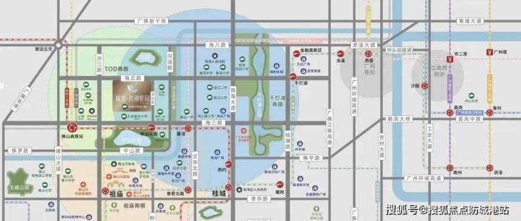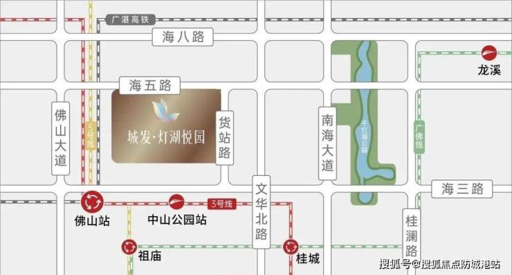 “城发·灯湖悦园”的另一大亮点是其无与伦比的交通优势。项目周边的交通网络发达,极大地方便了居民的出行。首先,项目紧邻地铁3号线和5号线的交汇处,距离地铁中山公园站约700米,未来居民可以通过地铁快速前往广州及佛山各大热门区域,享受便捷的城市生活。此外,海五路的通车将更进一步优化周边交通,直通千灯湖核心区,三公里以内即可轻松到达灯湖商圈。
