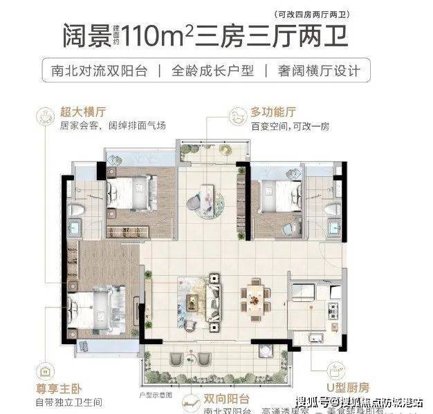 以三居室户型为例,客厅采用大面宽设计,搭配全景落地窗,采光通风俱佳,视野开阔,连接景观阳台,可将社区美景或城市风光尽收眼底,是家庭聚会、休闲娱乐的理想空间;餐厅与厨房紧密相连,厨房采用科学的 U 型或 L 型设计,操作台面宽敞,配备高端智能厨电,烹饪动线流畅,让烹饪成为一种享受。