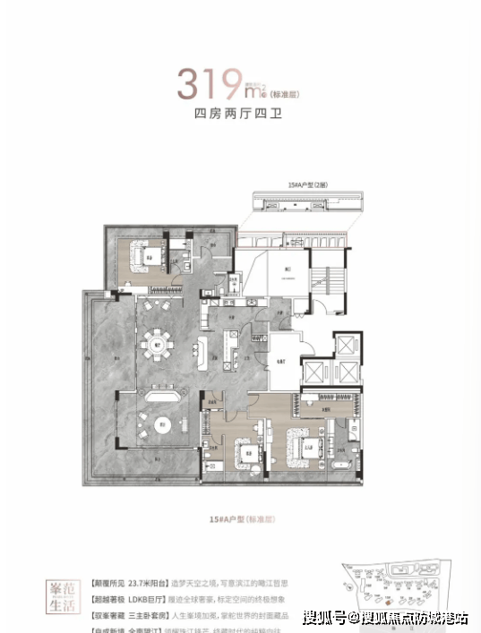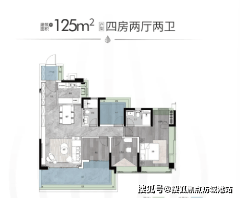 建面约125平四房两卫:四开间朝南,主卧南北对流设计,观景阳台长达近8米。