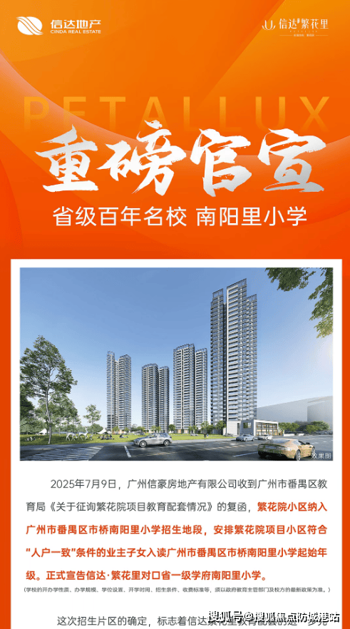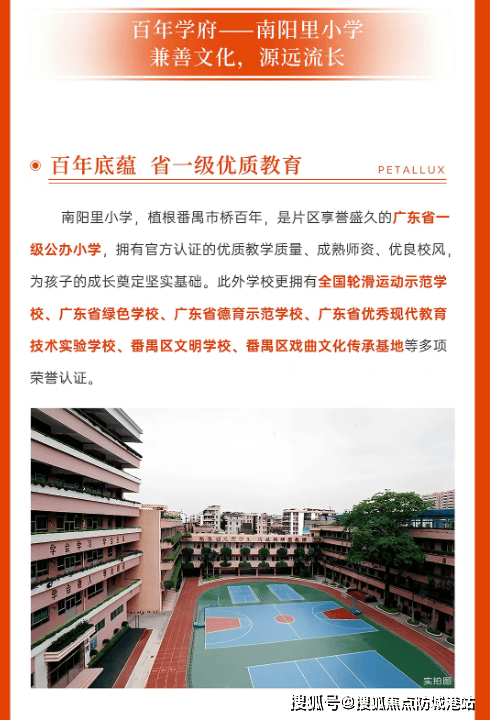 项目官宣对口**省一级南阳里小学**,南阳里小学作为番禺区知名公立小学,教学质量位居番禺第一梯队,师资力量雄厚,教学设施完善,办学理念先进,多年来培养了大量优秀学生,口碑极佳,是番禺家长心中的优质名校。官宣对口意味着,只要符合“人户一致”条件,业主子女即可正常入读该校,无需额外摇号、择校,入学有保障,解决了家长最担心的子女入学问题。