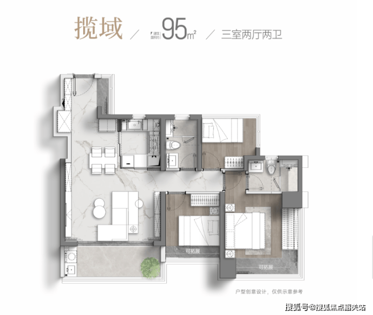 86㎡三房:南向四开间全朝南,主卧270°飘窗,实用率超100%;