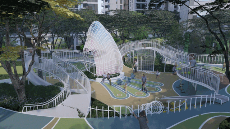 社区内部设置多种休闲娱乐设施,包括儿童活动区、景观水景以及花园空间等。其中儿童探险乐园面积约750平方米,为家庭提供亲子活动场所。同时还规划了艺术花园以及水景叠瀑景观,为居民提供休闲放松空间。