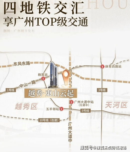 交通网络发达,距离地铁杨箕站、五羊邨站及体育西路站均在700至800米之间,且即将通车的10号线在广州大道中设站,步行仅需400米左右。驾车出行也极为便捷,通过中山一立交可快速到达东风东路、中山一路及内环路等主要干道。