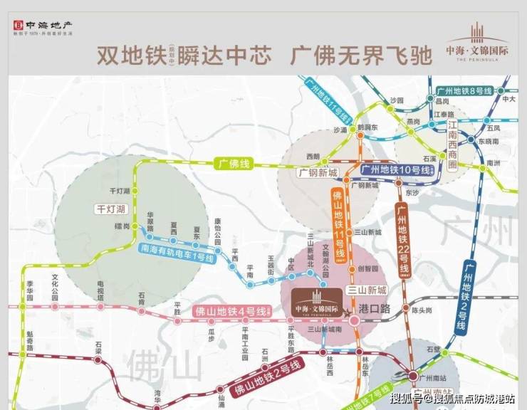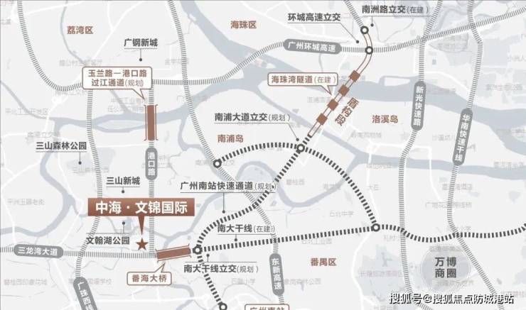 中海文锦国际地处佛山三山新城门户区位 属于广佛交界核心之一 多条城市干道交汇 项目东临港口路 规划建设的广钢隧道通车后将实现与广州荔湾区的快速连通 驾车至广钢新城仅需约六分钟 同时南侧番海大桥连通番禺南大干线 通车后约十分钟内直达长隆与广州大道 此外 项目临近在建的快速通道 可实现十五分钟内前往广州南站与海珠区 主城区通勤效率显著提升 项目还拥有双地铁规划利好 包括佛山地铁四号线与十一号线 四号线贯通禅城桂城与三水 十一号线连接广州荔湾与海珠 提供稳定高效的轨道交通系统 是广佛双核生活圈中的稀缺高通达住宅产品