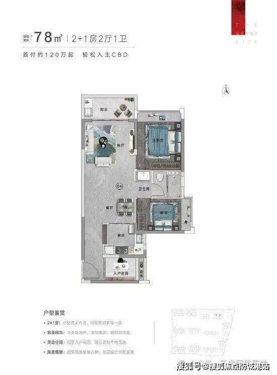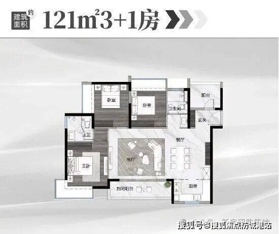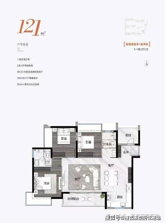 121㎡ 3+1房2厅2卫,+1房百变空间,L型入户尊崇体验,约8.1m长南北通透都荟宽厅,约5m长270°观景阳台,约46㎡豪宅式社交空间