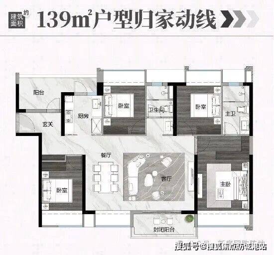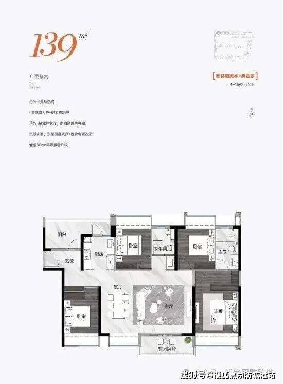 139㎡ 4+1房2厅2卫,约9㎡灵动空间,L型尊崇入户+归家双动线,约7m长都荟宽厅,南向通透四开间,灵动次卧,预留横竖双厅+西厨创意改造,全屋80cm阔景飘窗升级