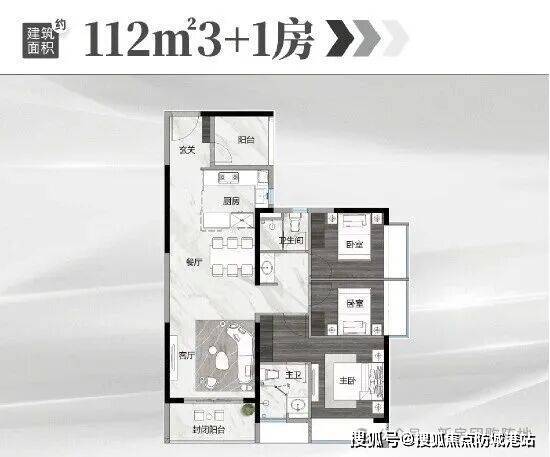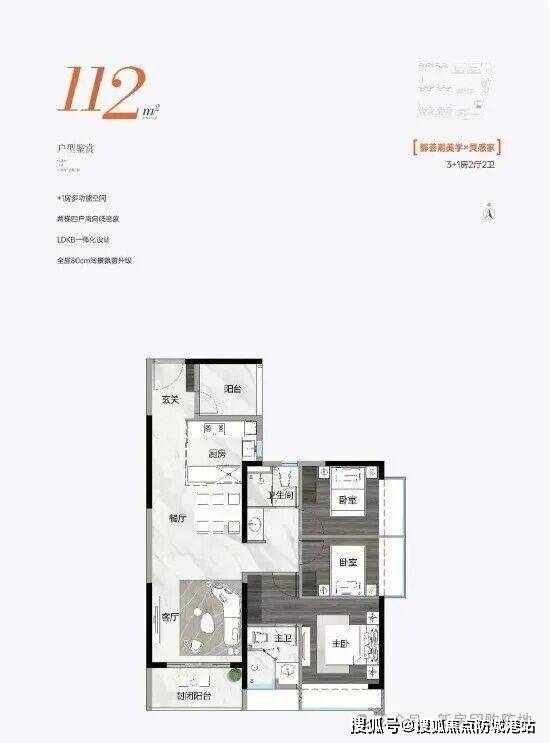 112㎡ 3+1房2厅2卫,+1房多功能空间,两梯四户南向低密度,LDKB一体化设计,全屋80cm阔景飘窗升级