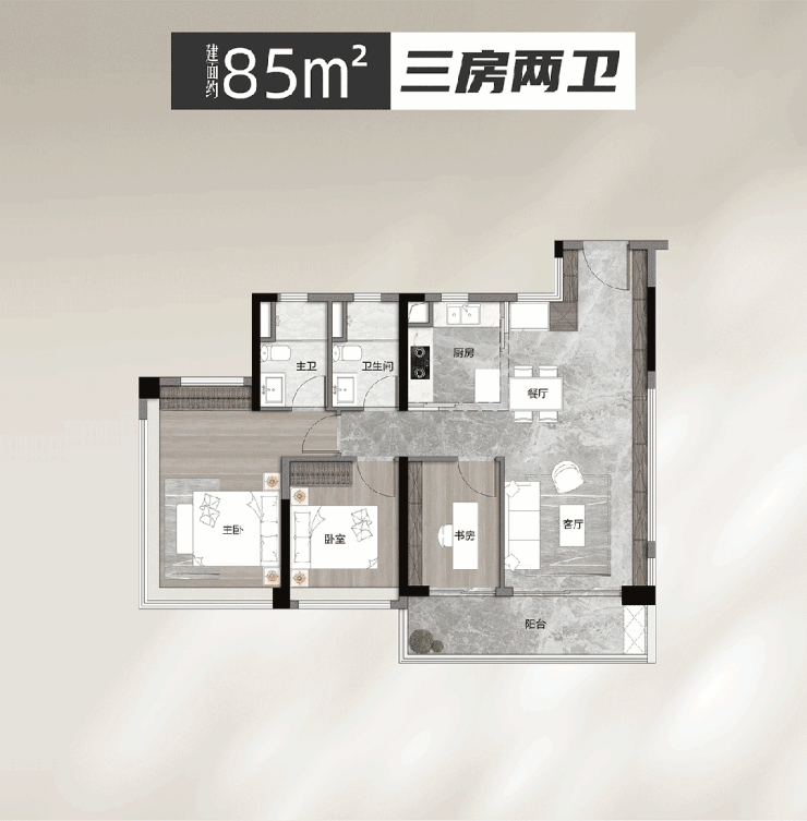 85平方米三房两卫:带6米大阳台,空间宽敞明亮。