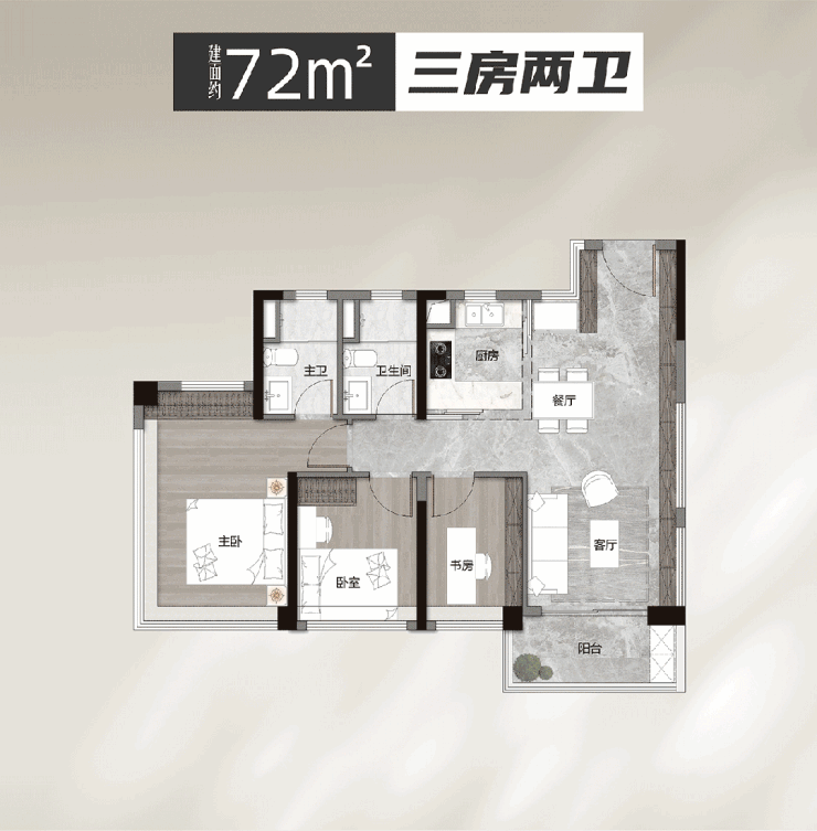 72平方米三房两卫:小户型设计,功能齐全,适合刚需家庭。