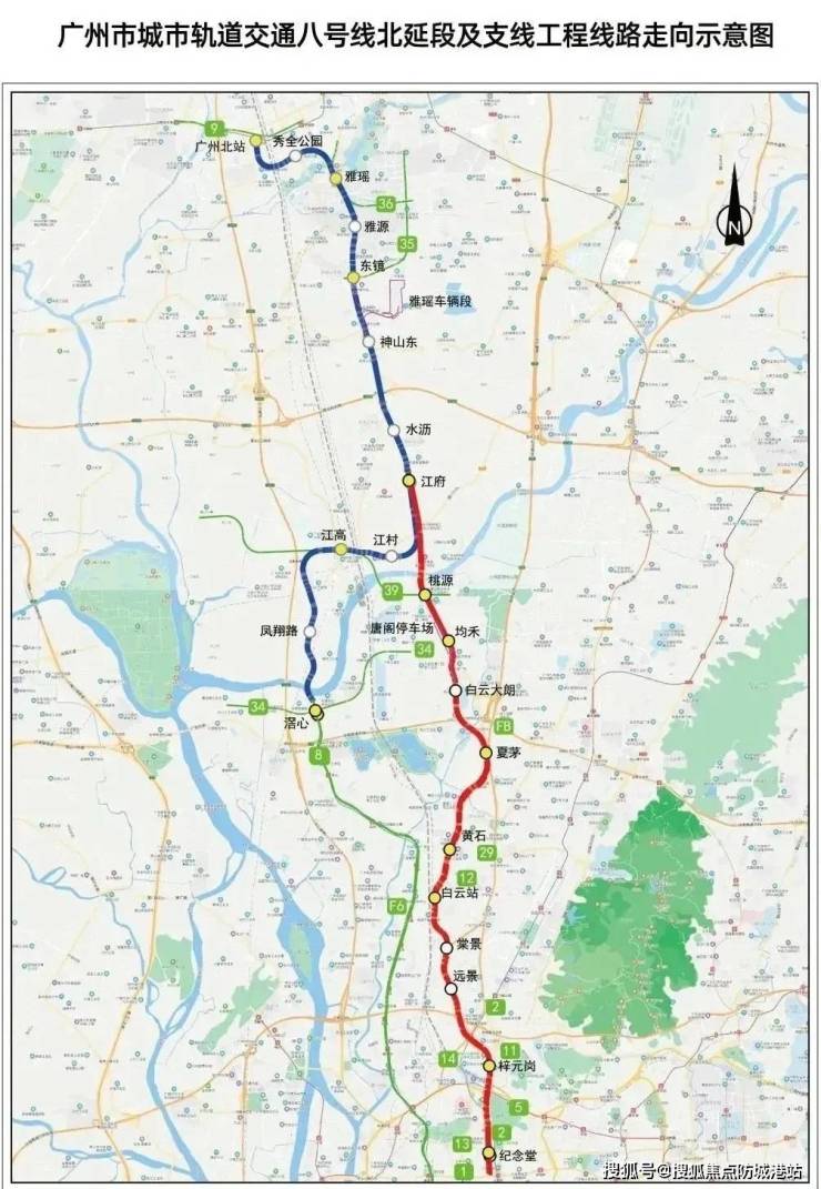广州地铁8号线北延段工程(滘心至广州北站)线路全长约20.7公里,为全地下敷设线路,共设置11座车站(不含江府站),分别为滘心、凤翔路、江高、江村、水沥、神山东、东镜、雅源、雅瑶、秀全公园、广州北站,其中换乘站5座,新建雅瑶车辆段。