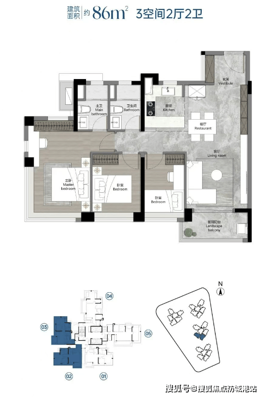 A:该户型除了入户全赠送L型收纳柜,主卧、次卧均预留嵌入式衣柜空间,客厅飘窗下方也可改造为储物区,整体收纳面积约8-10㎡,完全满足三口之家的衣物、杂物、家电收纳需求,空间利用率极高。