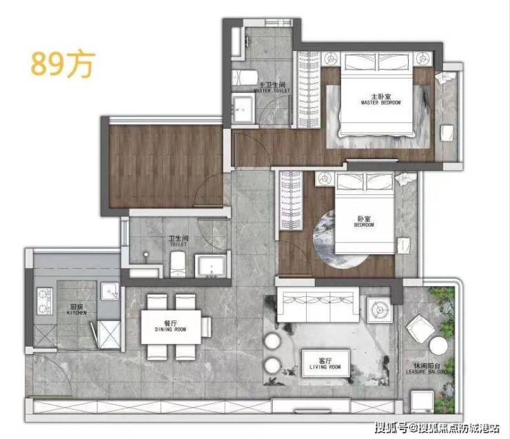 89㎡的三房,横厅设计,相比于78㎡的,主卧做了套房设计。且主卧与次卧的飘窗都很大,采光够好,住起来舒适度也会更高。