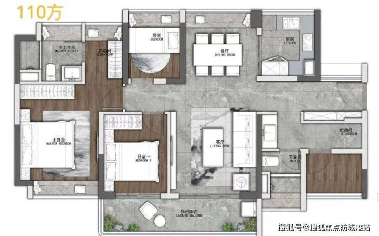 110㎡的3+1房,整体看起来很开阔,主卧更大气了,配备衣帽间。客厅阳台与次卧打通,所见景观更好。毕竟项目部分高层还可以望江,阳台够大也能放大景观优势。