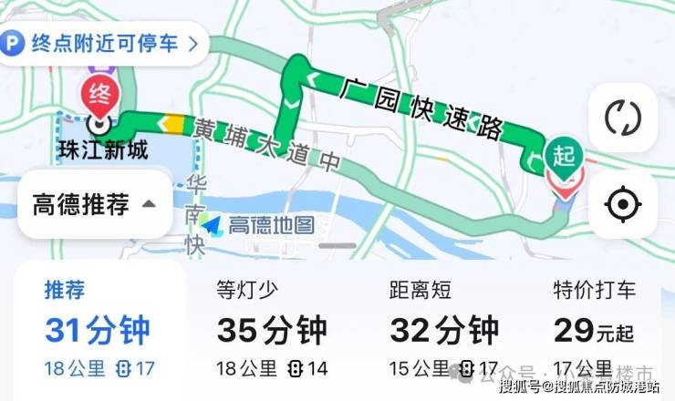 1. 自驾去往珠江新城:出小区后走护林路至茅岗路,再转到广园快速,然后进入科韵中路,最后转到黄埔大道,全程大约18公里,非高峰时段耗时31分钟左右,高峰时段可能会稍微慢一点,但总体来说,通勤压力不大。