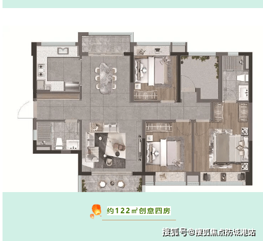 122㎡创意四房是项目的高端改善户型,空间更加宽敞奢适,布局更加合理,功能更加完善,适合追求高品质居住体验的改善家庭。该户型南北通透,全明设计,每一个空间都能享受充足的采光与良好的通风,避免暗房与潮湿问题;公共空间开阔大气,客厅开间宽敞,搭配超大景观阳台,可欣赏社区内部美景,同时阳台可作为休闲、晾晒的空间,提升空间利用率。