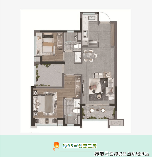 95㎡创意三房在89㎡户型的基础上,进一步扩大空间面积,提升居住舒适度,适合追求更大空间的刚需家庭或小型改善家庭。该户型同样采用全朝阳设计,采光通风良好,公共空间更加开阔,客厅开间更大,能够摆放更多家具,提升空间利用率;三个卧室空间更加宽敞,主卧配备独立飘窗,可作为休闲、阅读的小空间,提升居住体验;厨房采用U型设计,操作空间充足,方便日常烹饪;卫生间干湿分离,避免潮湿闷热,提升使用舒适度。