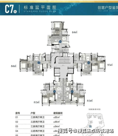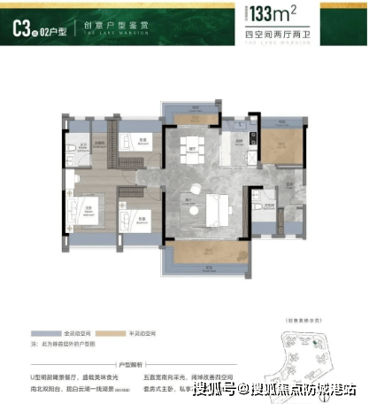 约84㎡三房两厅两卫:南向双瞰景阳台,U型明厨设计,阔绰套房式主卧。