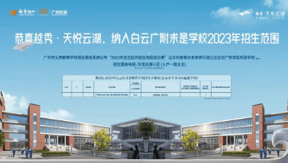 项目已被白云广附(广州市白云区白云广附云湖实验学校)划为在学区内。该校作为白云湖第一所名校,设有30班小学和18班初中,属于九年一贯制学校,并已开学运营。值得一提的是,白云广附近年来中考成绩一直名列前茅,以白云广附核心学校金广附为例,在2023年再次拿下广州中考最高分770的好成绩。丰富的教育设施,包括美术展厅、阅览室、书法室、录播室、舞蹈室等多种功能室,为学生提供了优质的学习环境。