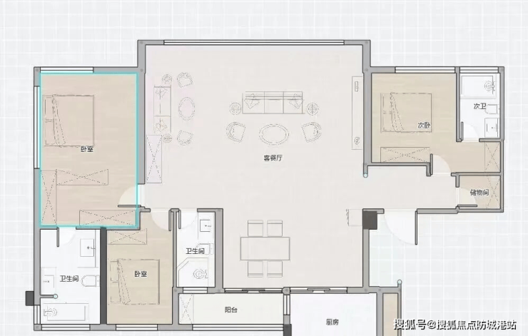 133㎡大平层,四叶草+横厅设计在广州独一无二,客厅甚至不需要打通,就能实现约7.4米大宽厅,媲美170㎡大平层。